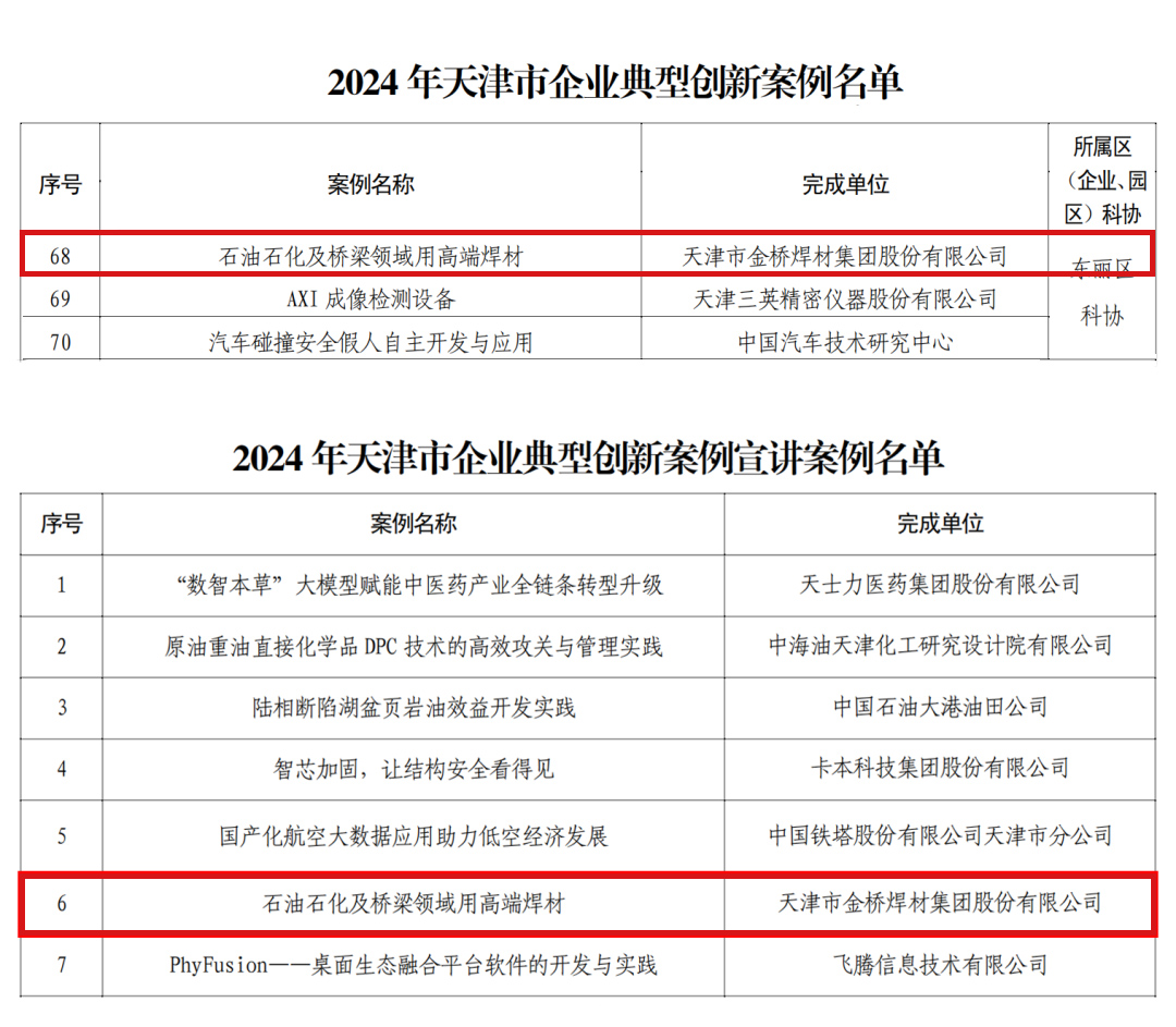 近日,天津市科协《2024年天津市企业典型创新案例入选名单》揭晓,集团石油石化及桥梁领域用高端焊材研发入选天津市企业典型创新案例十大宣讲案例,在全市进行宣讲汇报。