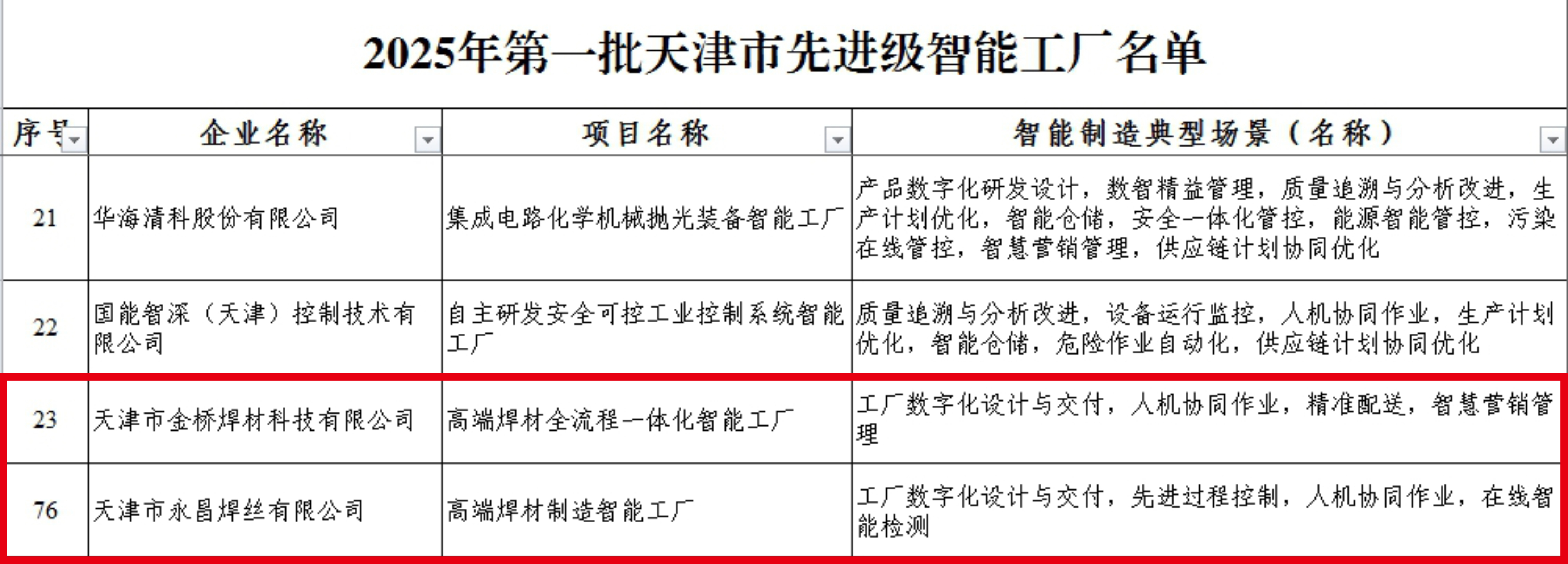 近日,天津市工业和信息化局正式公布2025年第一批天津市先进级智能工厂名单,集团两家子公司,天津市南宫ng28相信品牌力量-相信品牌的力量ng28-南宫28NG国际-南宫28在线登录-南宫ng28注册平台入口-南宫ng娱乐app下载-南宫28网页-南宫集团加拿大28-南宫ng娱乐app下载焊材科技有限公司与天津市永昌焊丝有限公司凭借行业领先的智能制造水平、创新技术应用及绿色低碳实践,成功跻身全市智能制造示范标杆行列。