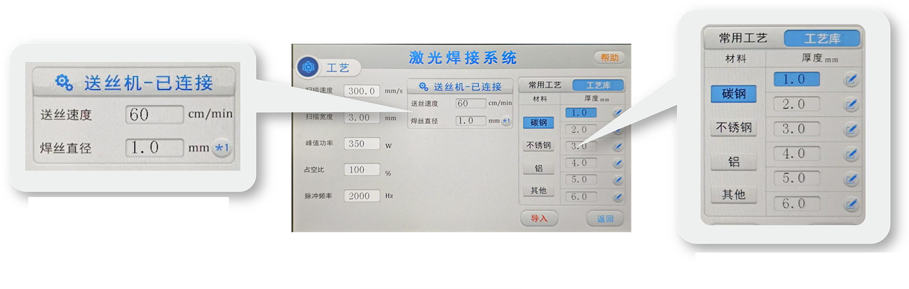 支持工艺库预存工艺包,选择材料及厚度,自动调整工艺参数。